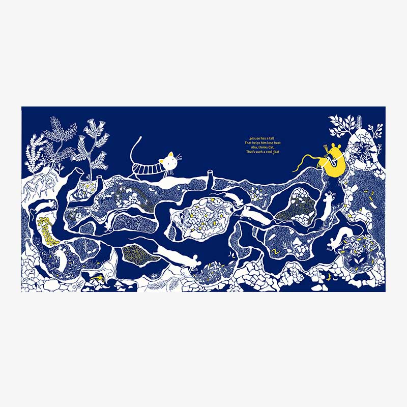 Comic verse about a cat in search of a new tail, rendered in the Warli tribal art style