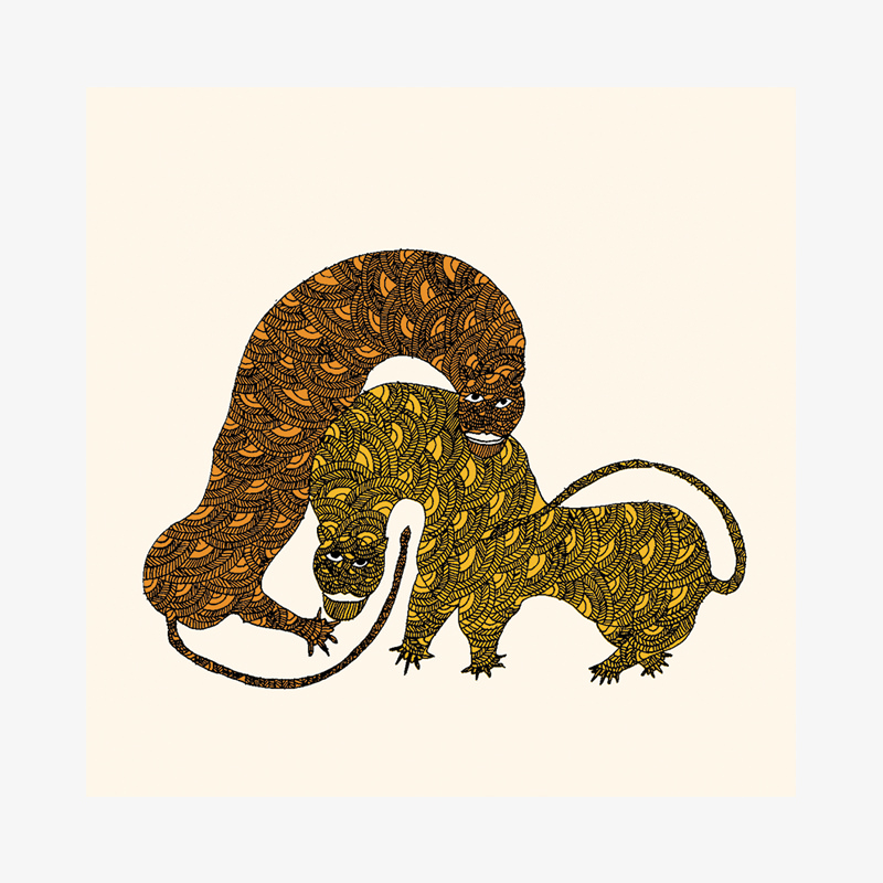 Tigers rendered in Gond style of tribal art silk-screen printed on handmade paper.